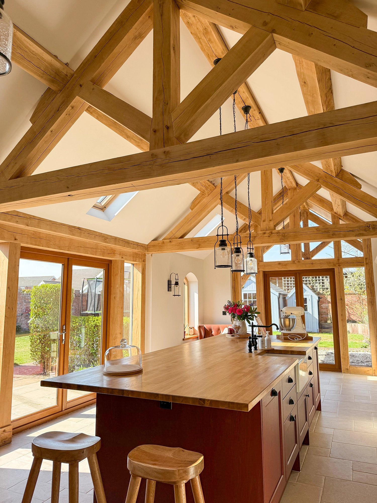 This wasn’t a simple update. It was a complete transformation of their existing outbuilding into a light-filled, oak-framed kitchen and dining space that now forms the heart of their home.